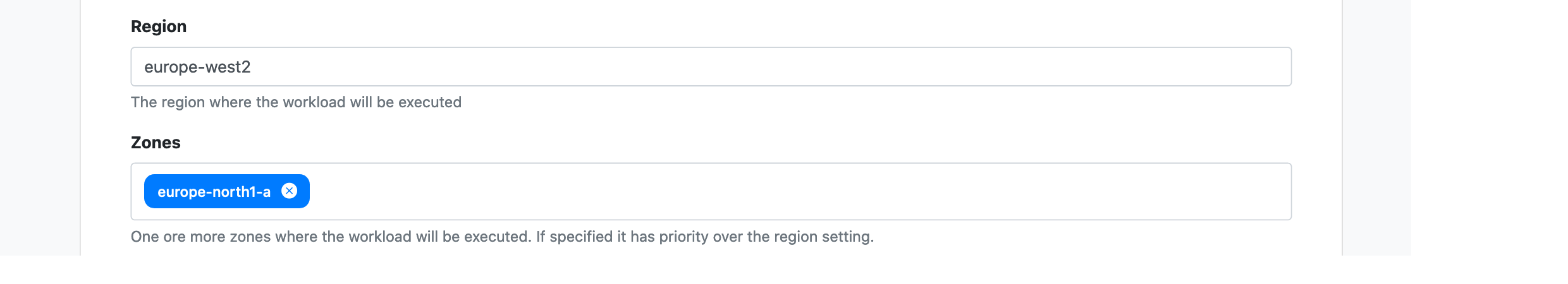 4. Select the Region and Zones where you'd like to deploy the workload. The Google Storage bucket created earlier should be accessible in the region.