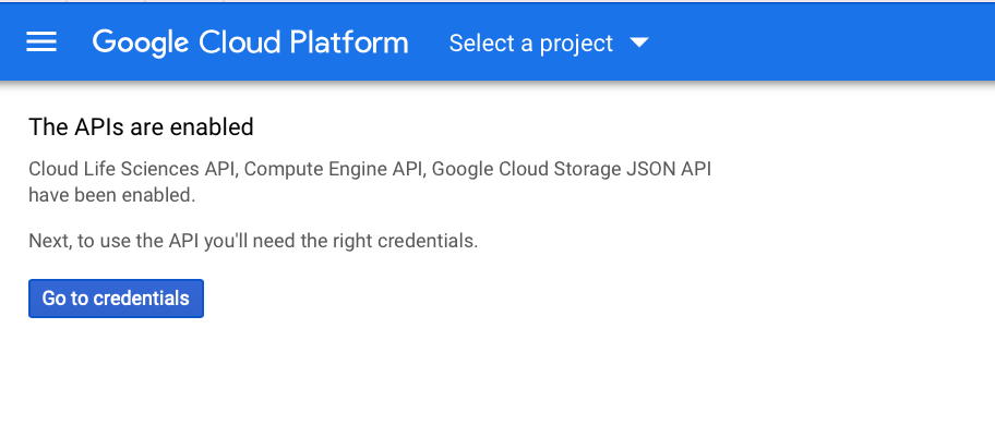 Enable the Google Life Sciences, the Compute Engine , and the Google Cloud Storage APIs.#