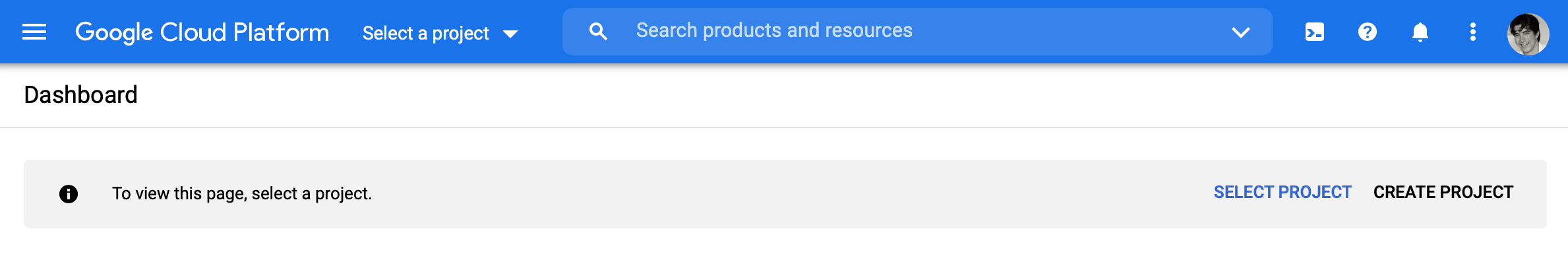Navigate to the Google Project Selector page and select an existing project or click CREATE PROJECT.