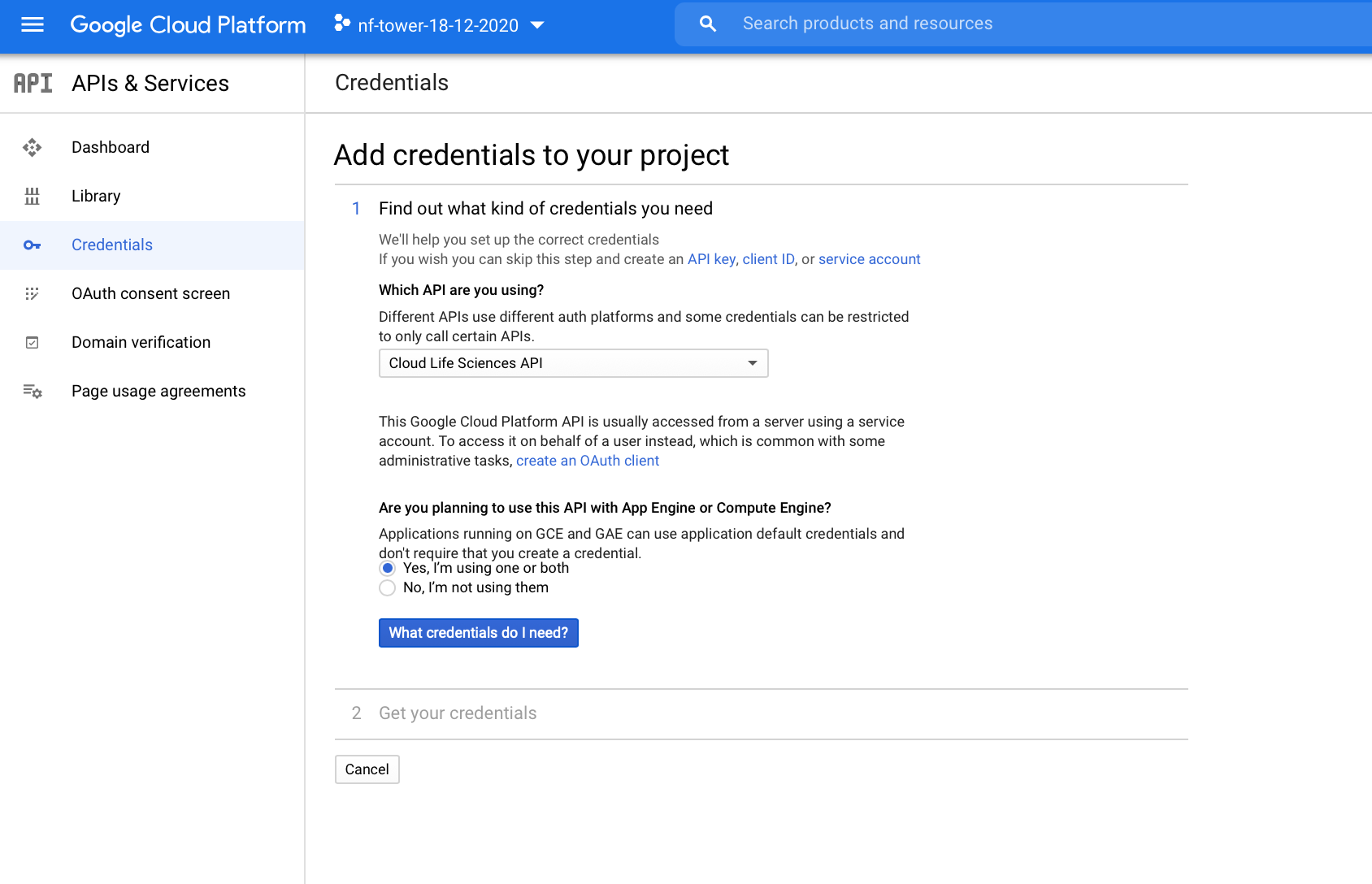 i) Select the Cloud Life Sciences API from the dropdown menu and select the radio button Yes, I'm using one or both to indicate we will use the Compute Engine API. The click What credentials do I need?