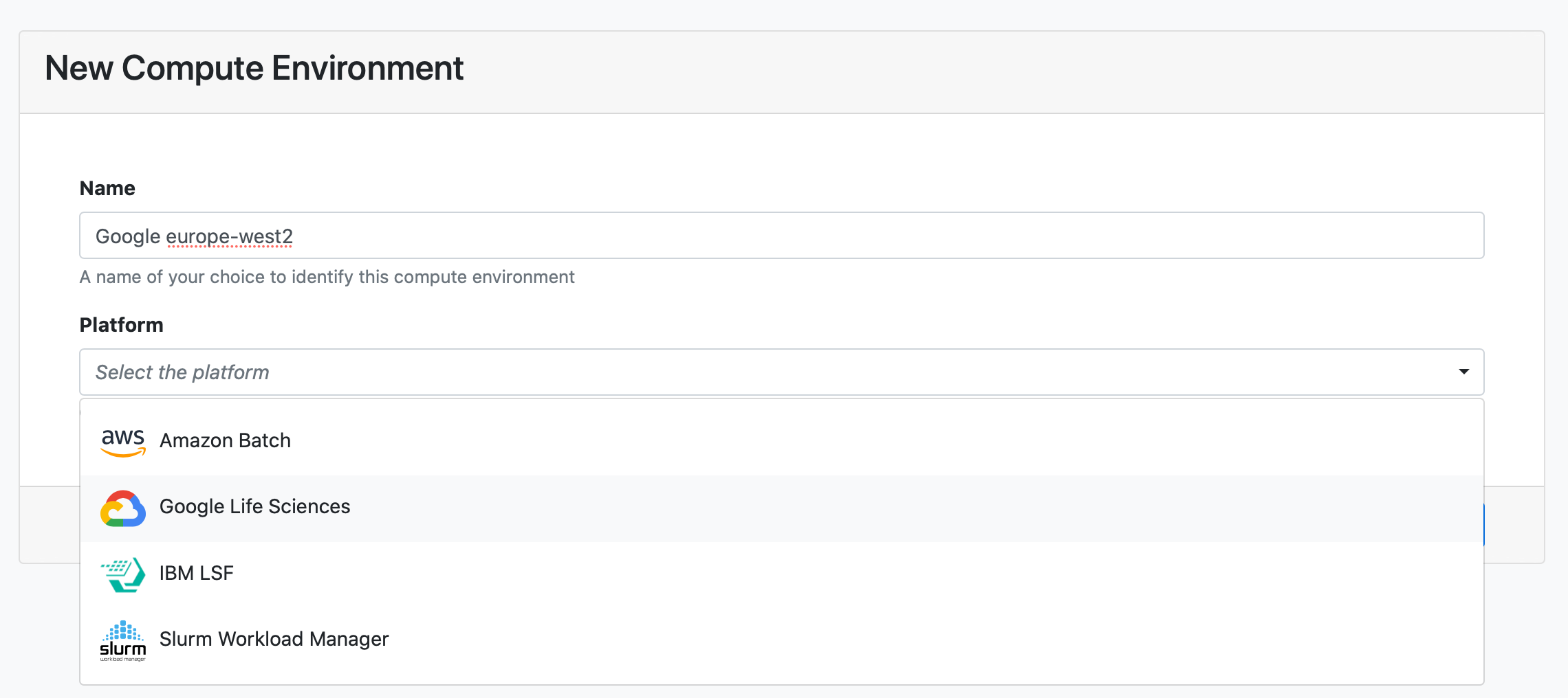 2. Enter a name for this environment. For example "Google Cloud Life Sciences (europe-west2)" and select Google Life Sciences as the target platform.