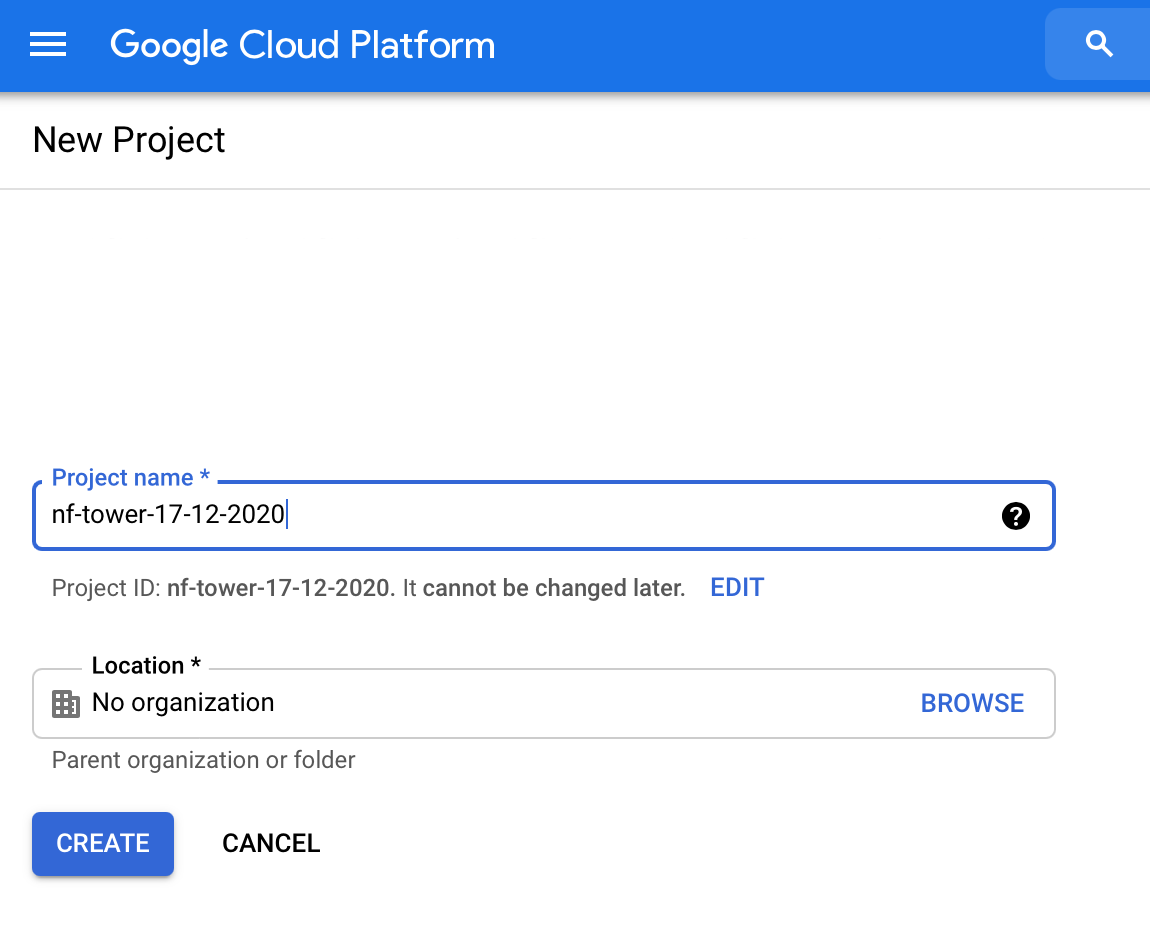 Enter a name for your new project e.g: "tower-nf", if you are part of an organization the location will be set by default to match your organization parameters.