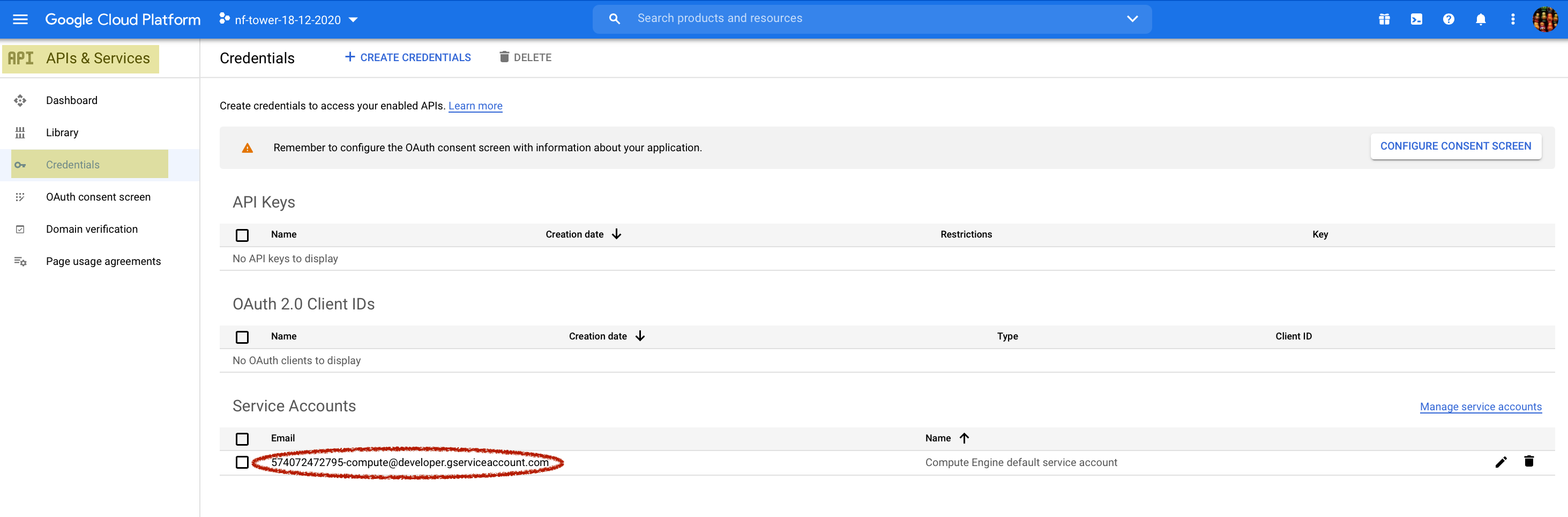 You will be redirected to the API & Services page and the Credentials section. Note a Compute Engine default service account has been created. Copy the email address as you will need this to configure Google Storage.