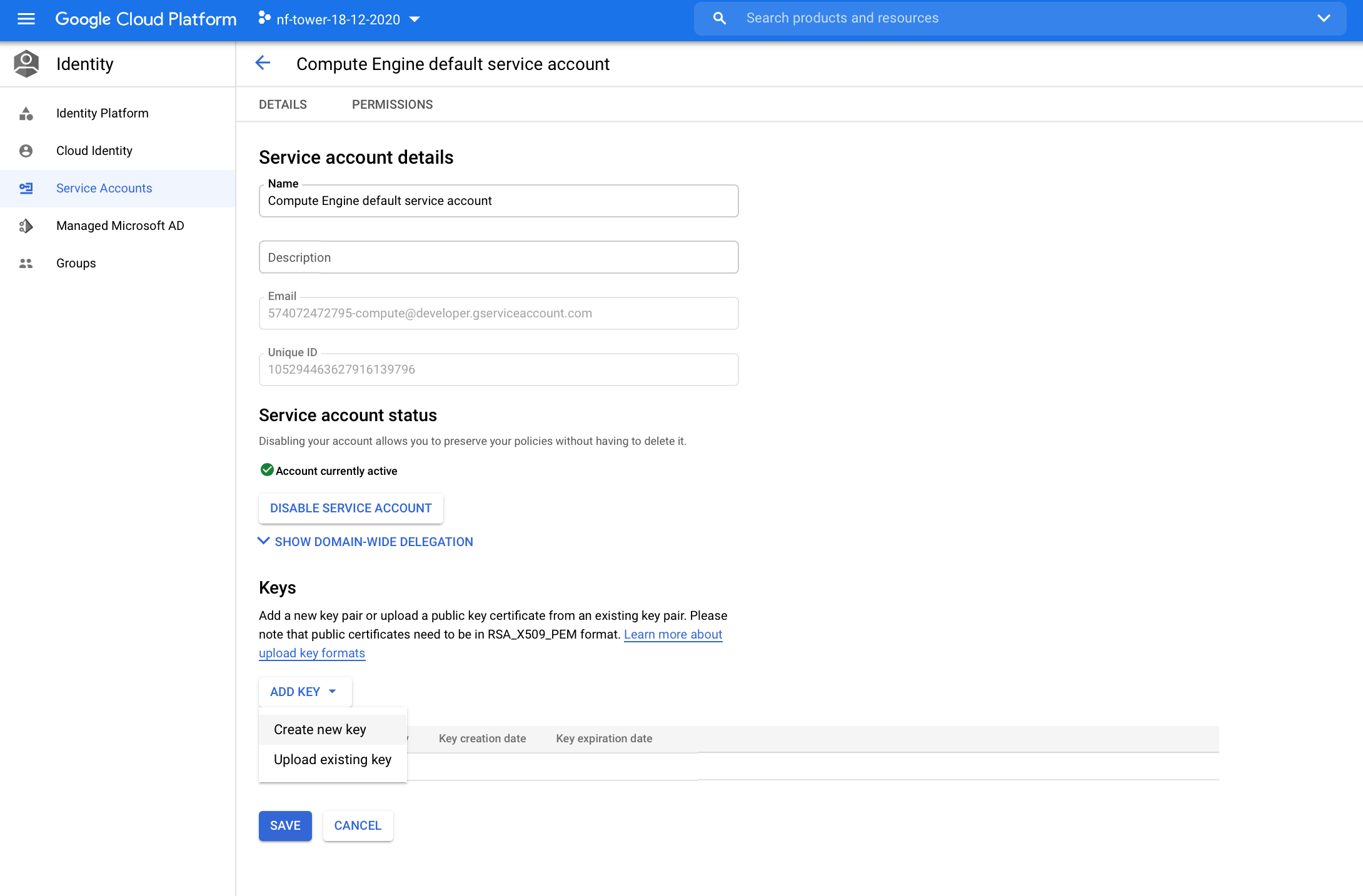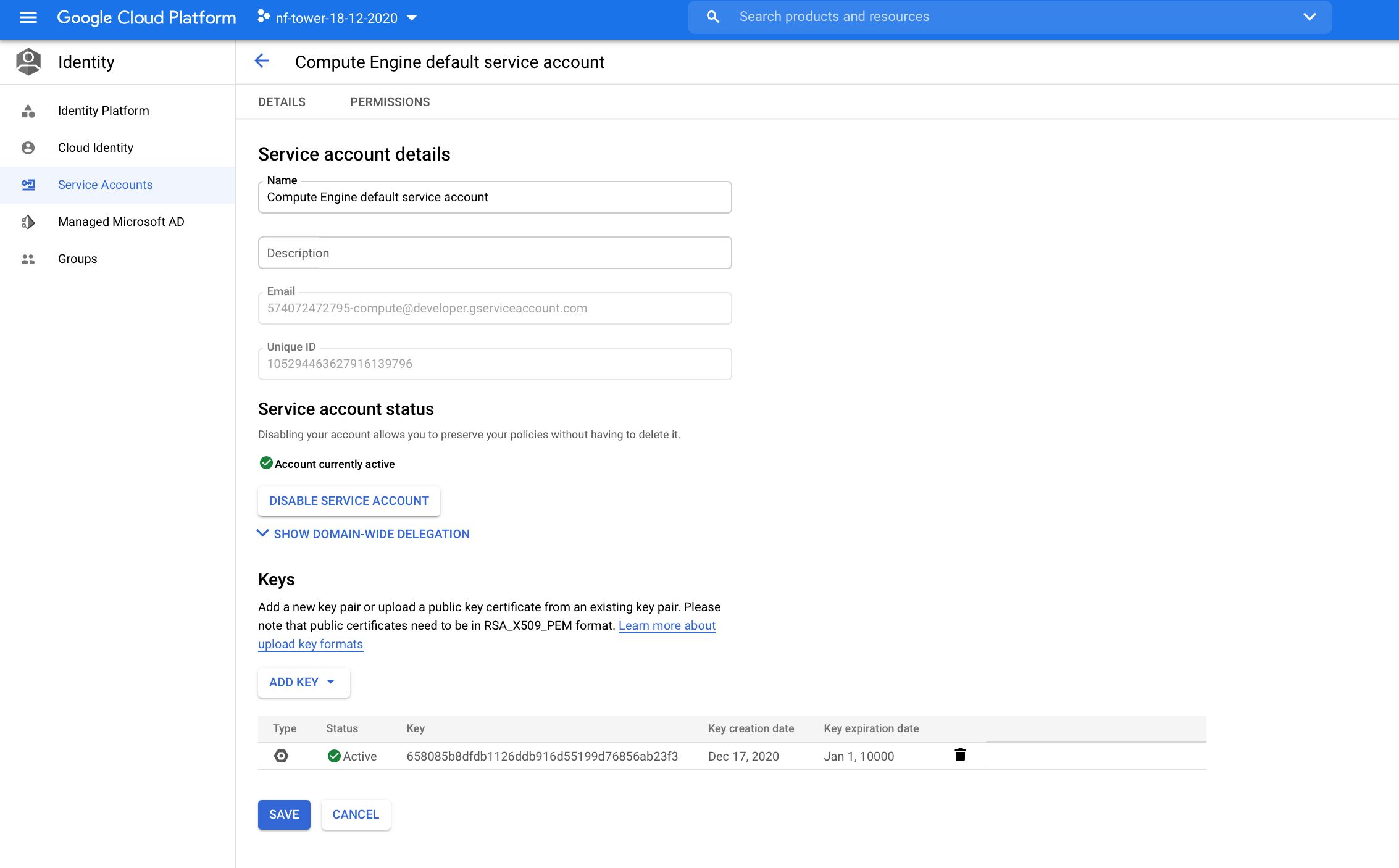 A JSON key will be downloaded to your computer. This is the credentials used by Tower and you will need it to configure the Tower compute environment. In the Service accounts page, you can see your key is now active and you can manage it from here.