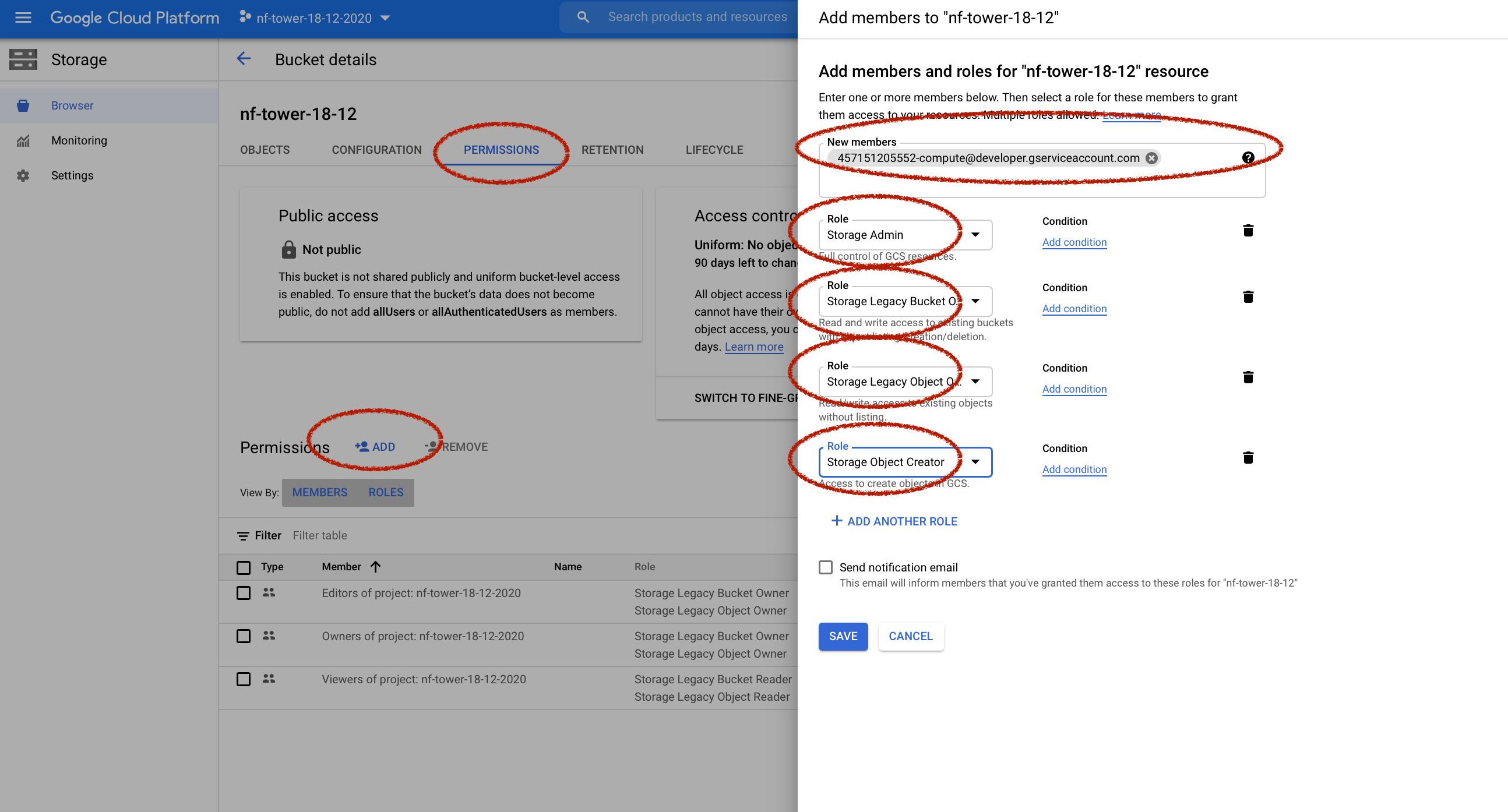 iii) Copy-paste the service account email created above into the new members box and add the following roles: