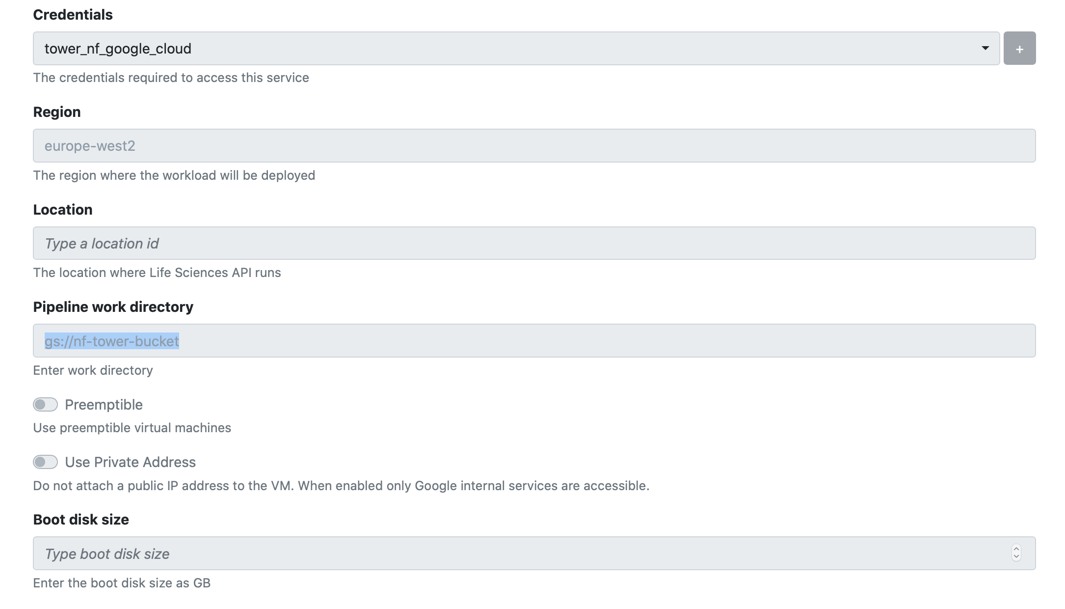 6. Enter the bucket URL in the Pipeline work directory e.g. gs://my-google-bucket-name.