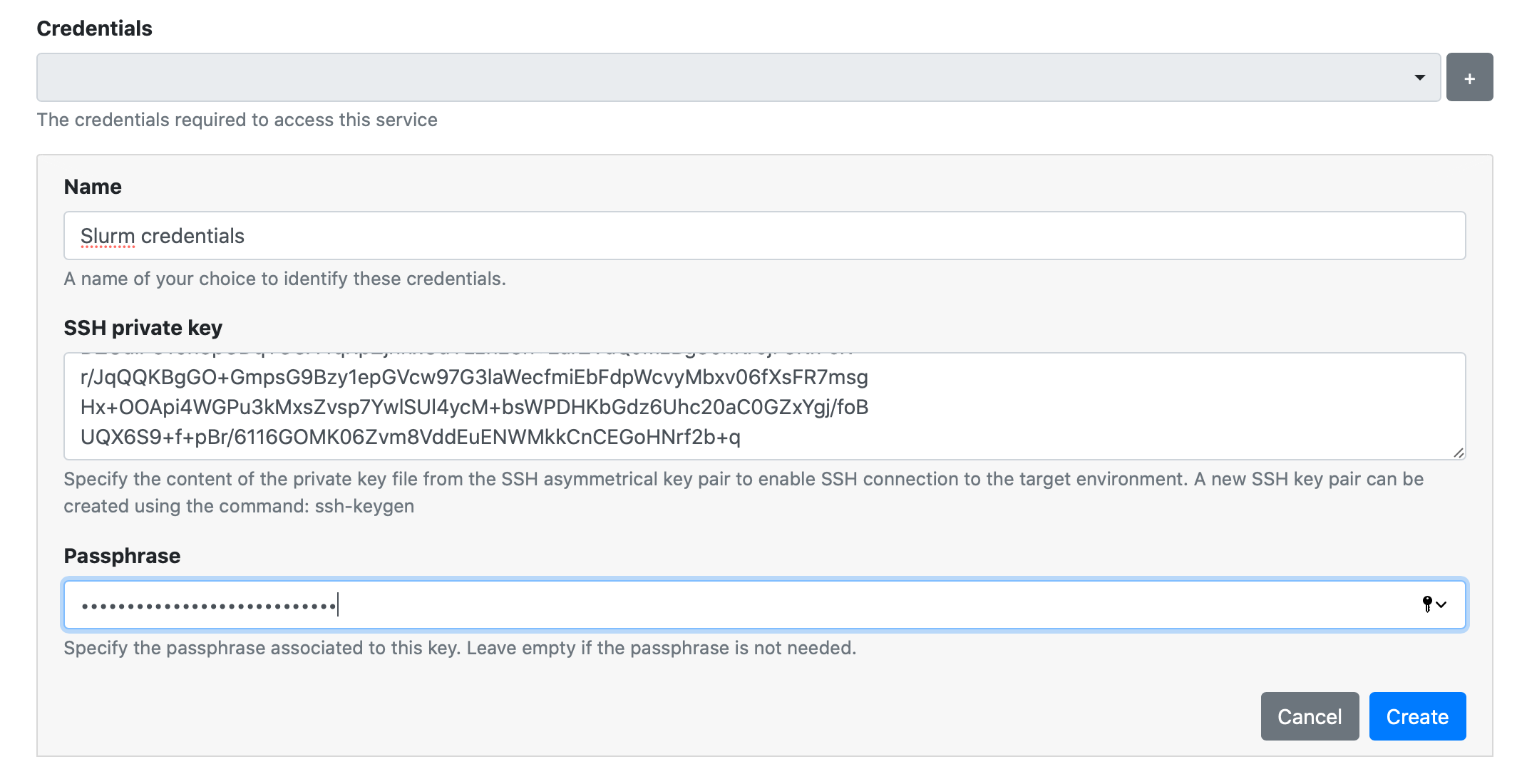 5. Enter your SSH private key and associated Passphrase, if required then click Create.