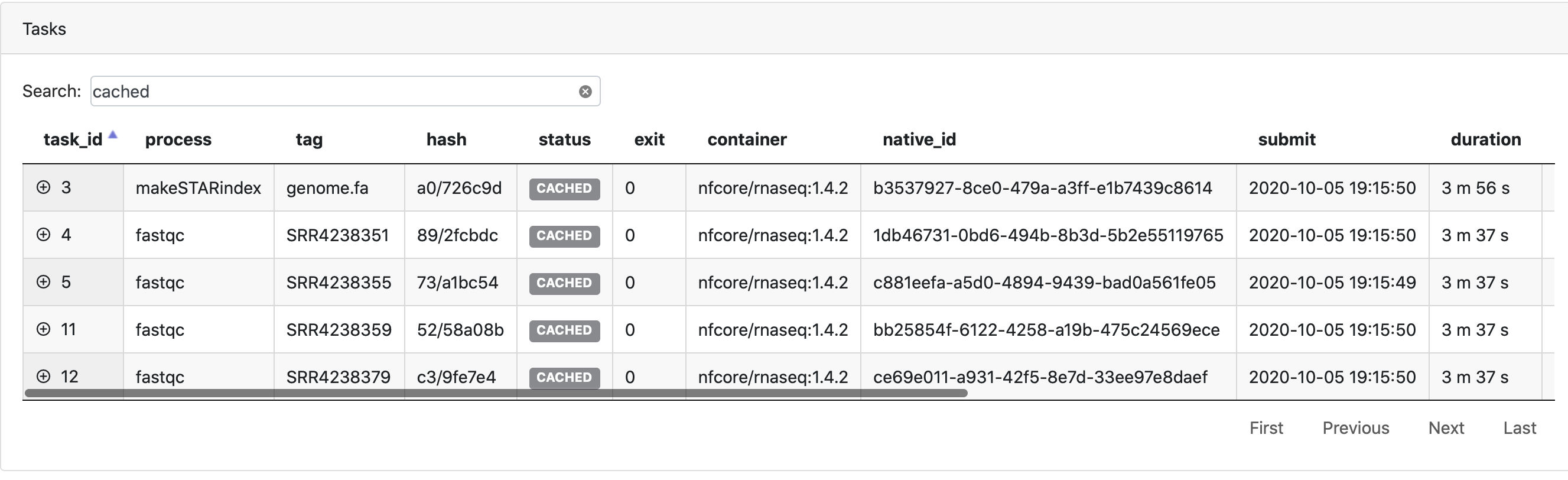 Selecting a status in status section filters the task table. E.g. clicking in the CACHED card in the status column.