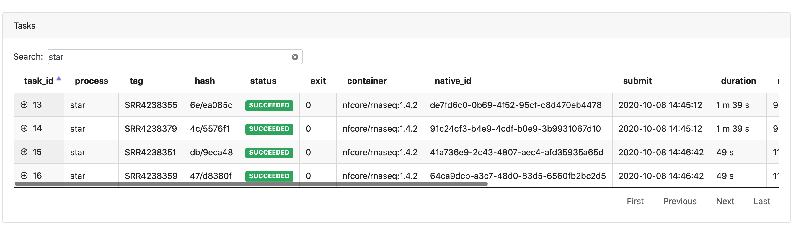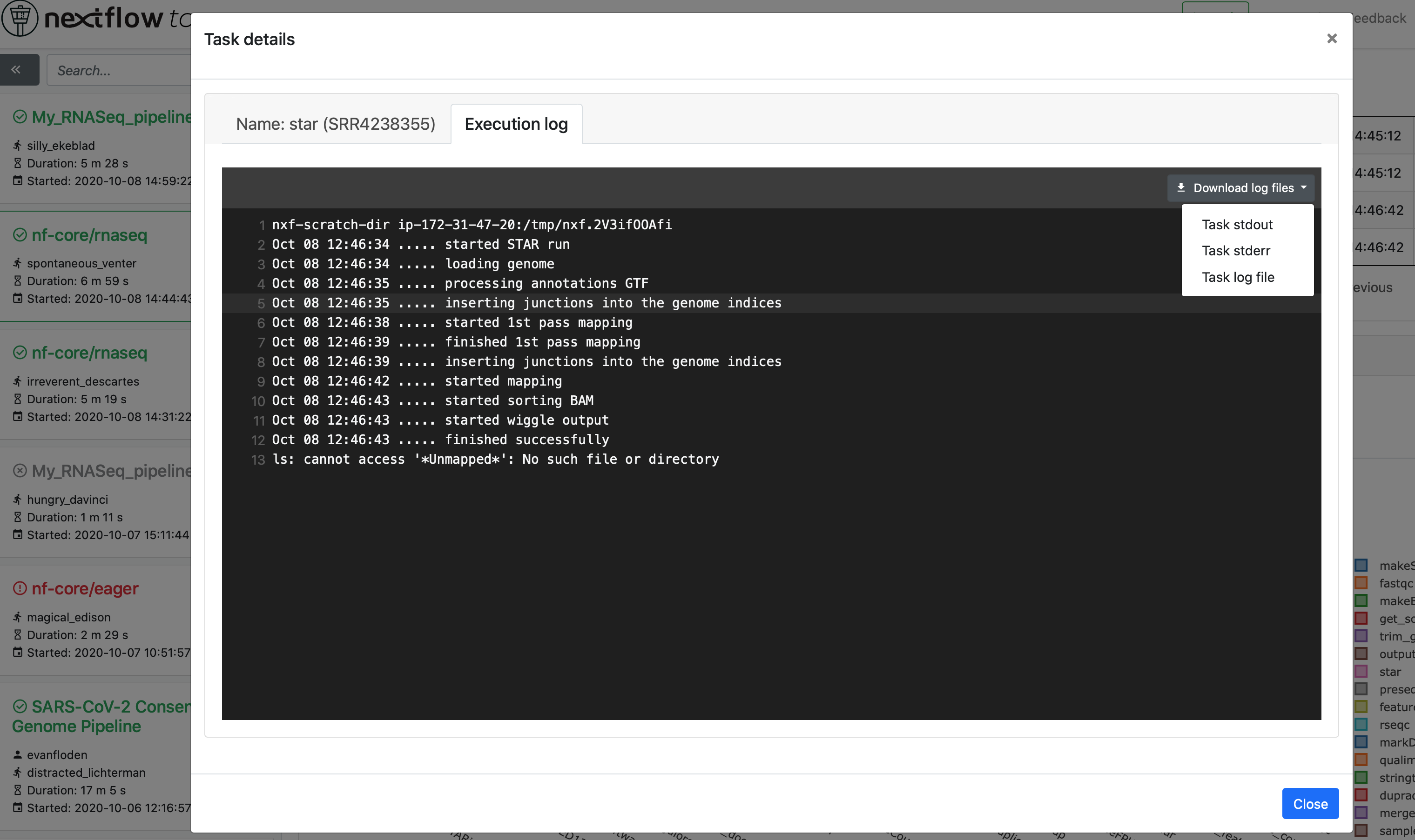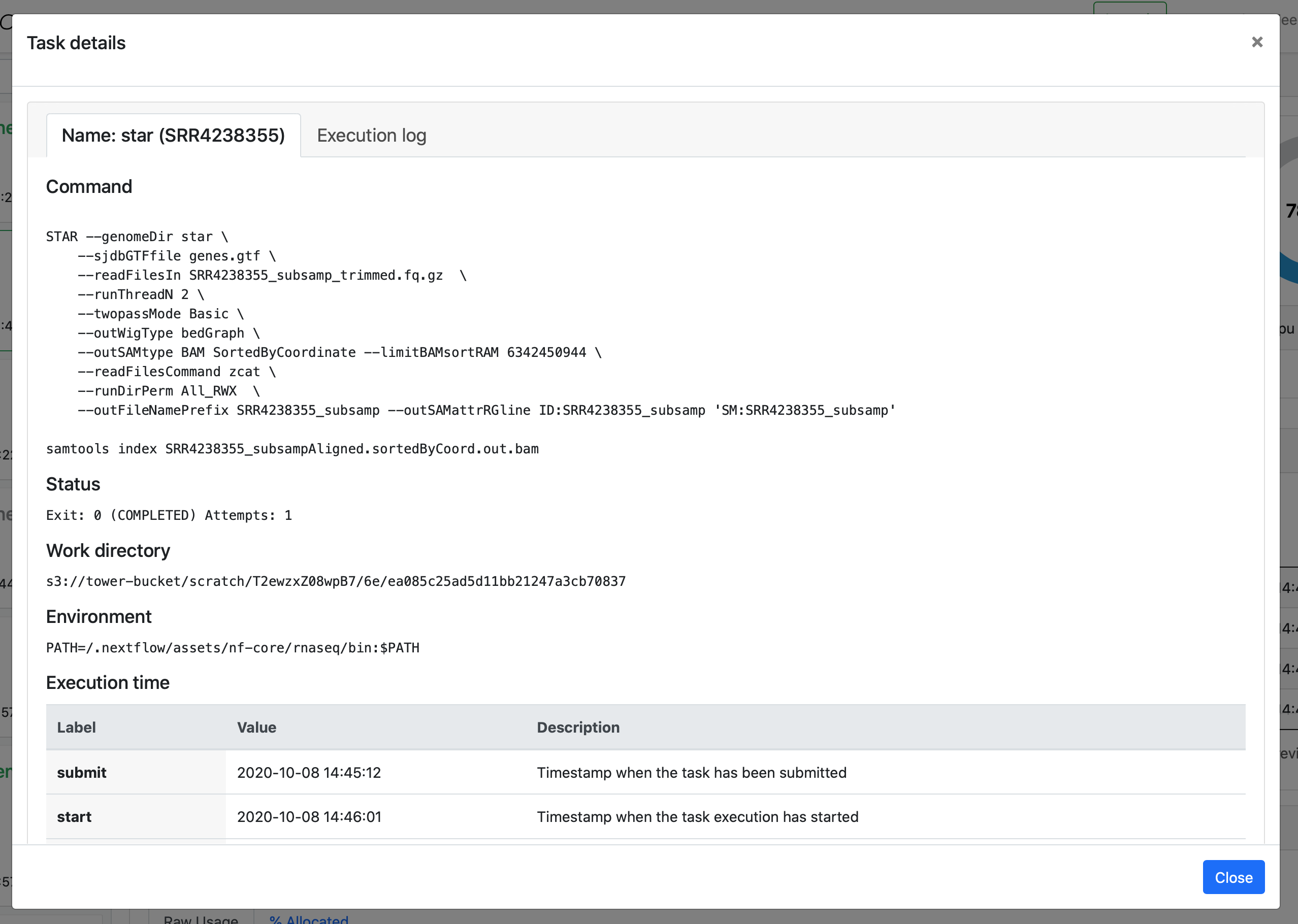 The Execution log provides a realtime log of the individual task of a Nextflow execution.